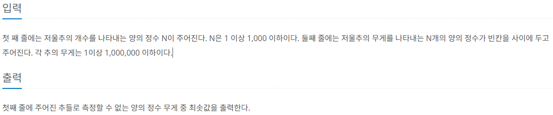 예를 들어, 무게가 각각 3, 1, 6, 2, 7, 30, 1인 7개의 저울추가 주어졌을 때, 이 추들로 측정할 수 없는 양의 정수 무게 중 최솟값은 21이다.