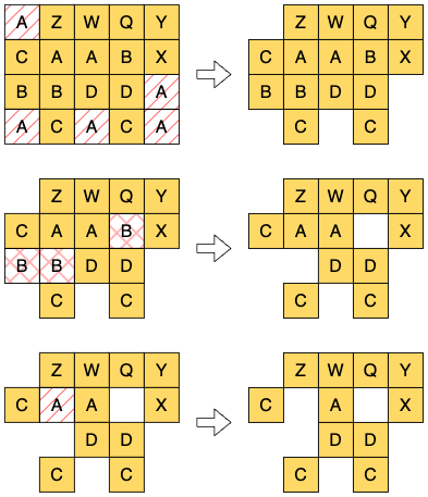 A 회사의 물류창고에는 알파벳 대문자로 종류를 구분하는 컨테이너가 세로로 n 줄, 가로로 m줄 총 n x m개 놓여 있습니다. 특정 종류 컨테이너의 출고 요청이 들어올 때마다 지게차로 창고에서 접근이 가능한 해당 종류의 컨테이너를 모두 꺼냅니다. 접근이 가능한 컨테이너란 4면 중 적어도 1면이 창고 외부와 연결된 컨테이너를 말합니다.