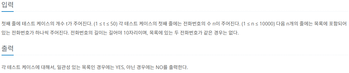 전화번호 목록이 주어진다. 이때, 이 목록이 일관성이 있는지 없는지를 구하는 프로그램을 작성하시오.