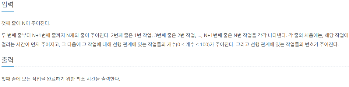 문제를 요약하면, N개의 작업이 주어지고 각 작업은 선행 작업이 있어 선행 작업이 모두 완료되어야지만 해당 작업을 수행할 수 있다.