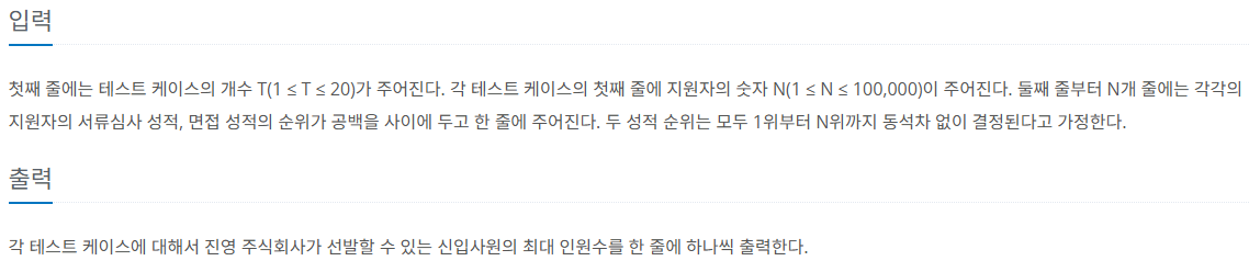 따라서 위에서부터 순회하며 이전 등수보다 면접 등수가 작은게 있다면 해당 인원은 선발되지 않는 것이다.