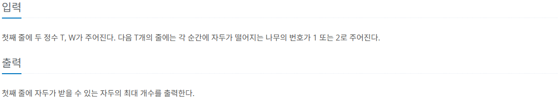 문제를 요약하면 T개의 자두가 1혹은 2에서 떨어질 때 받을 수 있는 자두의 최대 개수를 구하는 것이다.