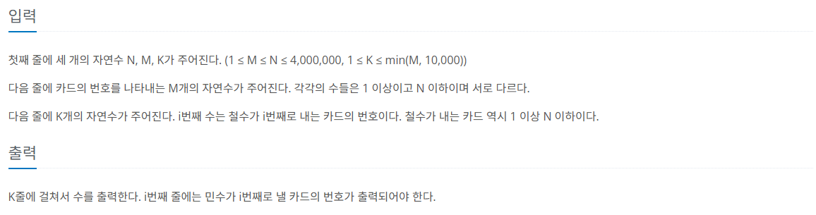 문제를 요약하면 M개의 카드가 주어지고 K개의 입력이 주어지면 M개의 카드 중 입력보다 큰 수중 가장 작은 수를 출력하면 된다.