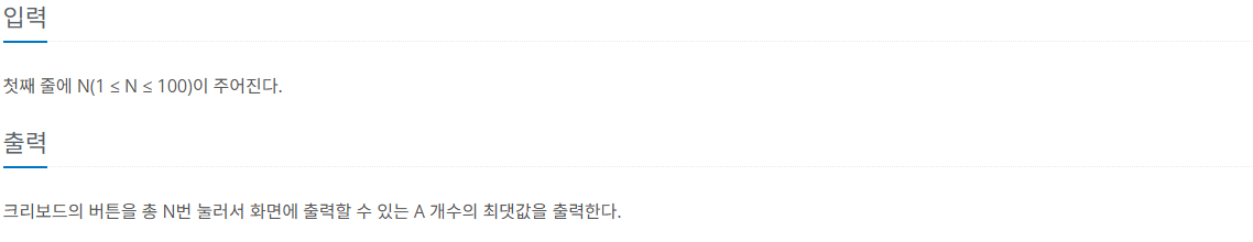 크리보드의 버튼을 총 N번 눌러서 화면에 출력된 A개수를 최대로하는 프로그램을 작성하시오.