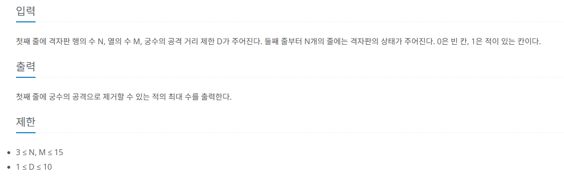 문제를 요약하면 N x M 격자에 적들에 대한 정보가 주어졌을 때 궁수 3명을 배치해 최대한 많은 적을 처리한다면 몇 명을 처리하는지 구하면 된다.