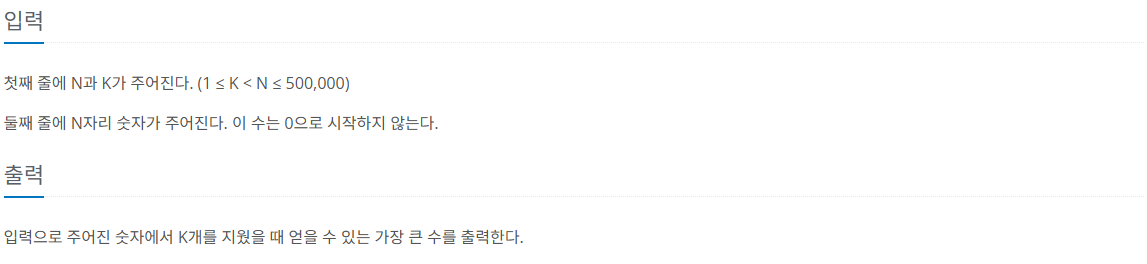 문제를 요약하면 길이가 N인 숫자가 주어졌을 때 K개의 숫자를 제거해 가장 큰 수를 만들면 된다.