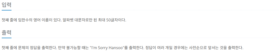 임문빈은 임한수의 영어 이름으로 팰린드롬을 만들려고 하는데, 임한수의 영어 이름의 알파벳 순서를 적절히 바꿔서 팰린드롬을 만들려고 한다.