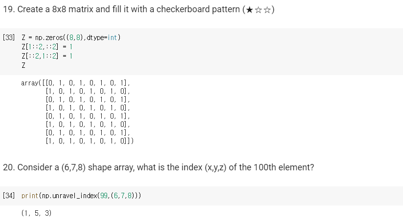 19. index를 이용하여 checkboard를 만든다. step을 주어 행렬을 변경한다.