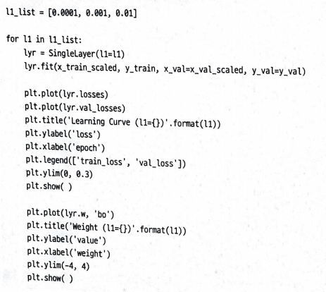 L1 규제의 강도를 0.0001, 0.001, 0.01 세가지로 훈련을 해보자