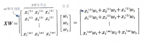 행렬 곱셈의 결과로 각 샘플마다 특성의 값과 가중치를 곱하여 더한 결과를 얻을 수 있다.