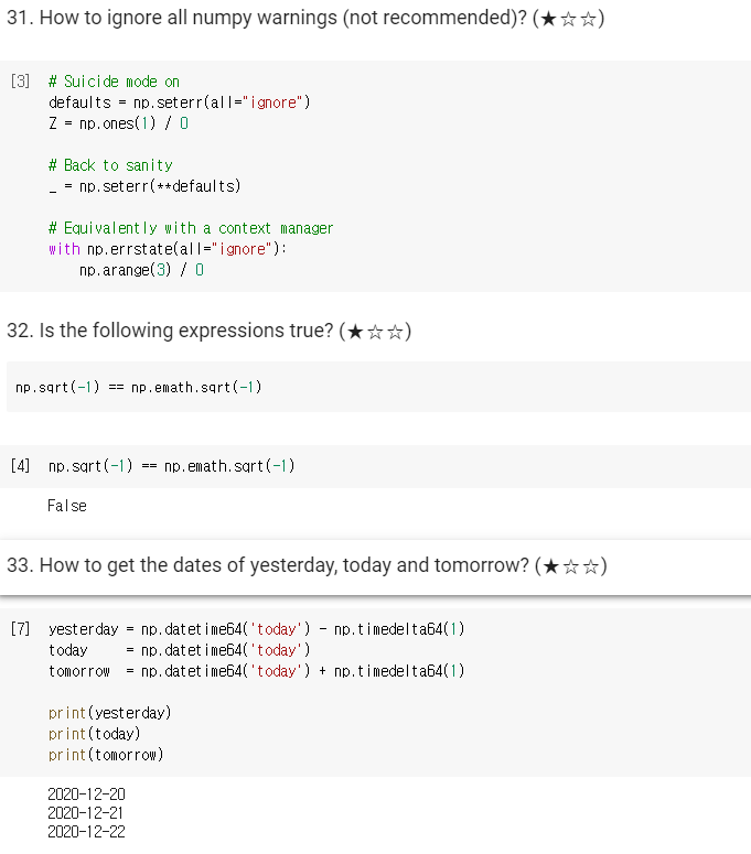 31. np.seterr(): err를 설정하는 함수이다. 모두 무시하게 설정한다.