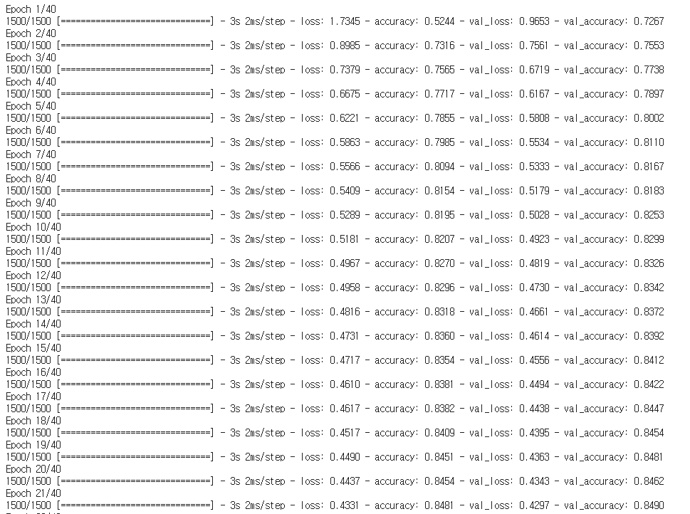40번의 에포크로 정확도는 약 86% 임을 확인했다.