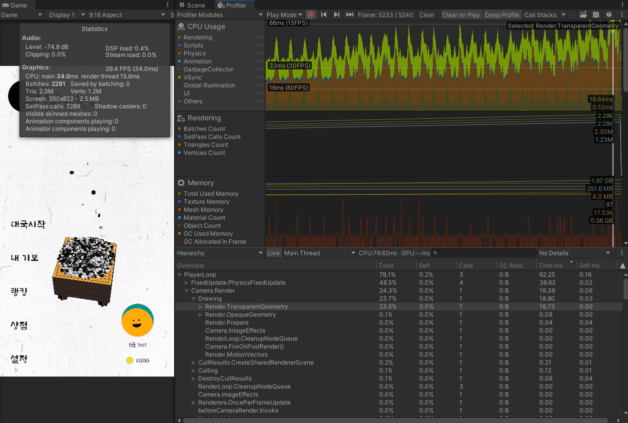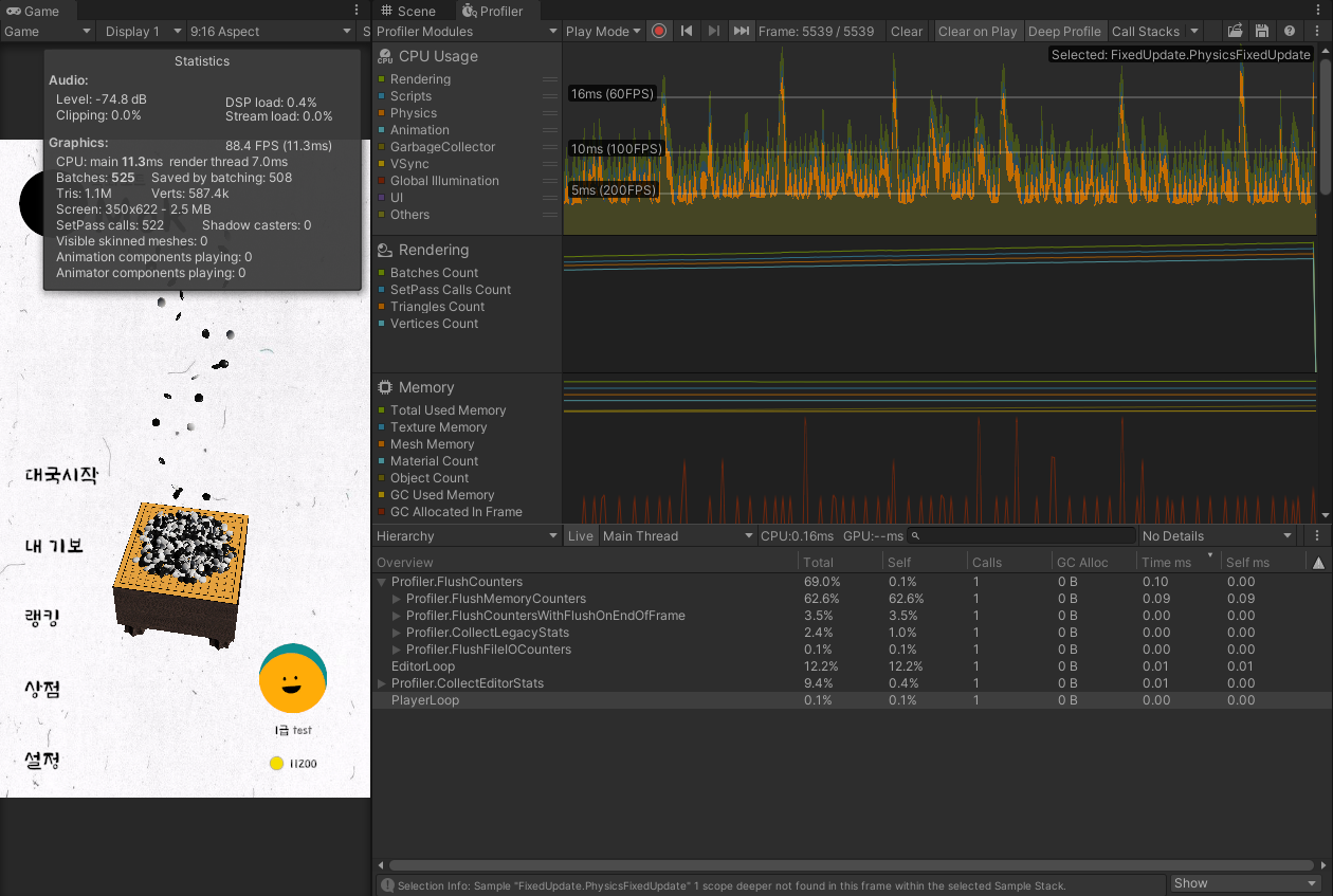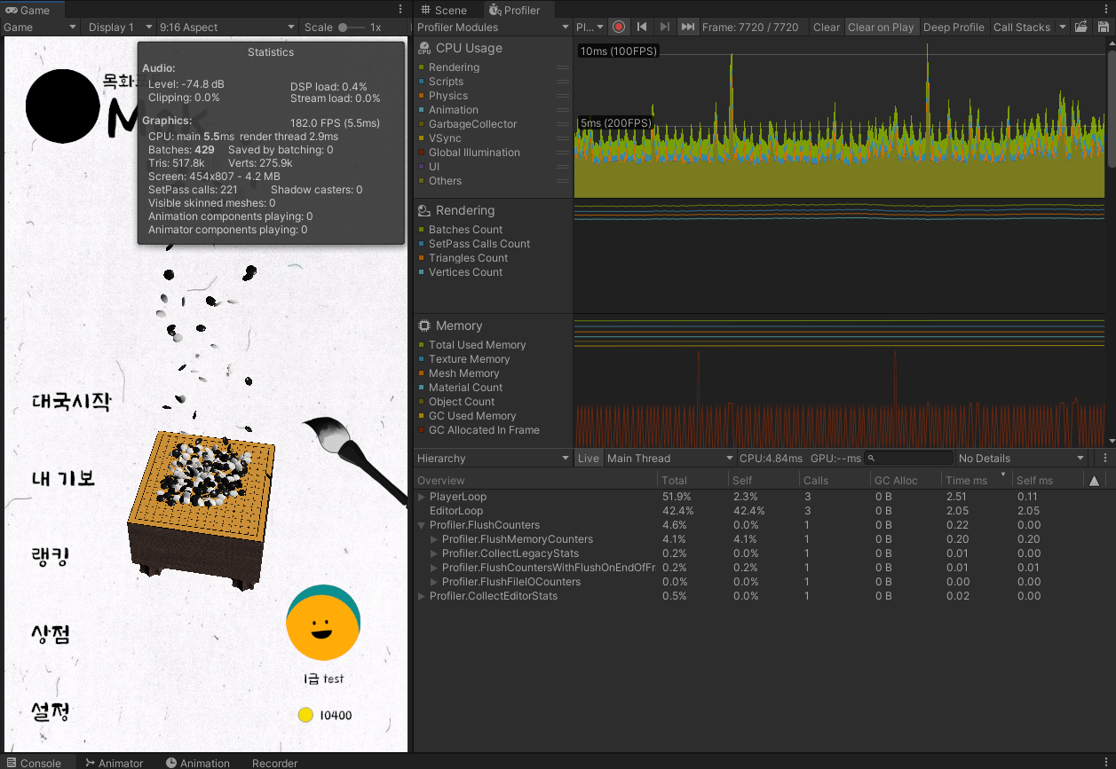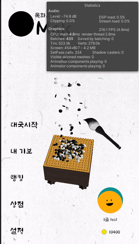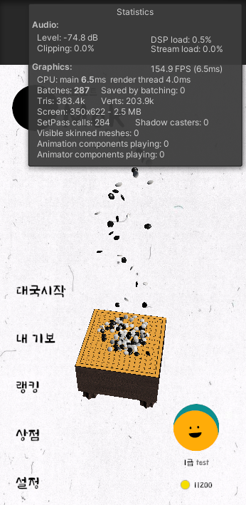 30초 정도 게임을 진행시켰을 때 연출을 위해 쌓아둔 바둑돌들이 많이 쌓이며 프레임이 20대까지 떨어진다.