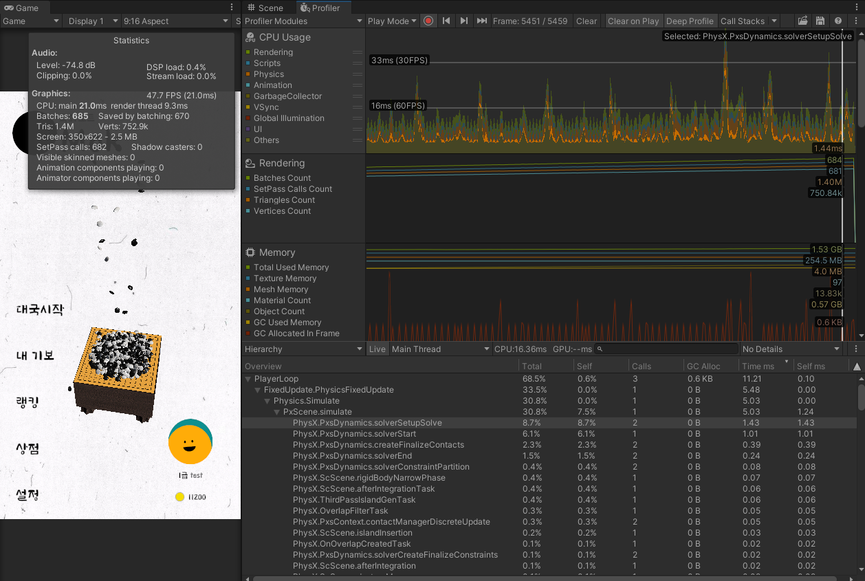 Profiler를 살펴보니 물리 연산에서 많은 시간이 소모된다.