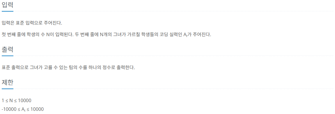 Elly는 그녀가 가르칠 수 있는 모든 학생들의 코딩 실력을 알고 있다. 각각의 코딩 실력 Ai는 -10000부터 10000 사이의 정수로 표시되어 있다. 그녀는 팀워크와 코딩 실력이 모두 적절한 팀을 만들기 위해, 세 팀원의 코딩 실력의 합이 0이 되는 팀을 만들고자 한다. 이러한 조건 하에, 그녀가 대회에 출전할 수 있는 팀을 얼마나 많이 만들 수 있는지를 계산하여라.