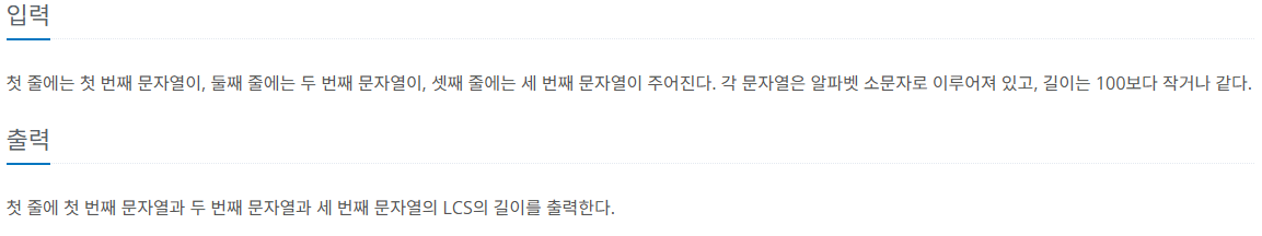 문자열과 놀기를 세상에서 제일 좋아하는 영식이는 오늘도 문자열 2개의 LCS(Longest Common Subsequence)를 구하고 있었다. 어느 날 영식이는 조교들이 문자열 3개의 LCS를 구하는 것을 보았다. 영식이도 도전해 보았지만 실패하고 말았다.