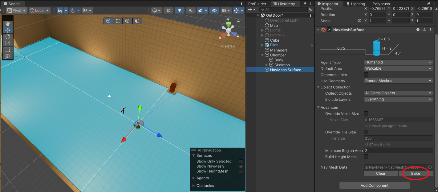이동 가능한 영역을 지정하기 위해 'NavMesh Surface"를 씬에 배치해 보자.
