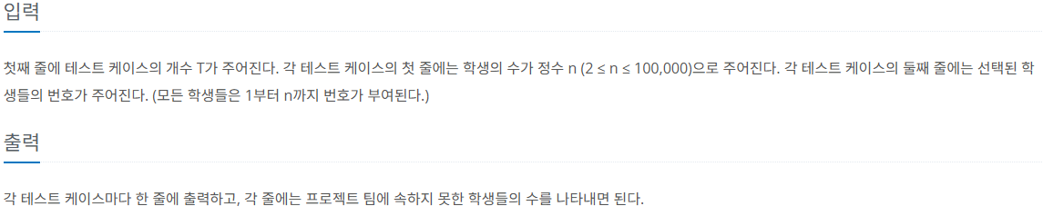 문제를 요약하면, 각 학생이 같이 팀이 되고 싶은 한 명을 선택했을 때, 몇 명이 팀을 이루지 못하는지 구하면 된다.