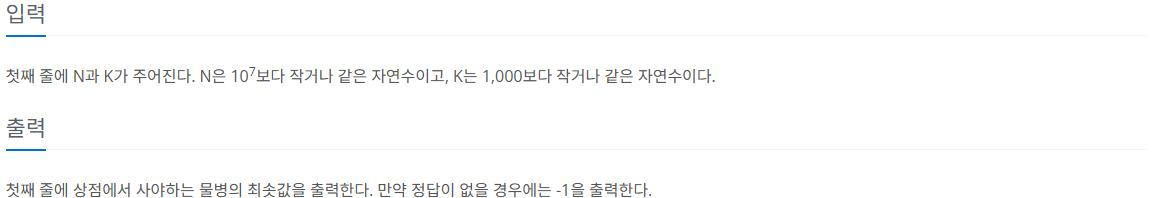 이런 제약 때문에, N개로 K개를 넘지않는 비어있지 않은 물병을 만드는 것이 불가능할 수도 있다. 다행히도, 새로운 물병을 살 수 있다. 상점에서 사는 물병은 물이 1리터 들어있다.
