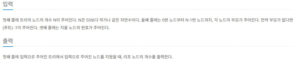 문제를 요약하면 트리의 구조가 주어지고 특정 노드를 하나 삭제했을 때 리프노드의 개수를 구하면 된다.