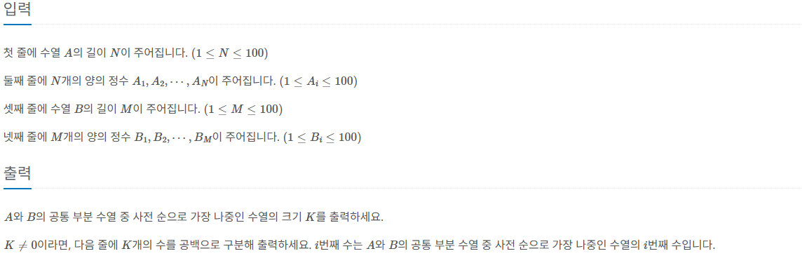 문제를 요약하면 두 수열 A, B가 주어지면 사전순으로 가장 늦는 공통 부분 수열을 구하면 된다.