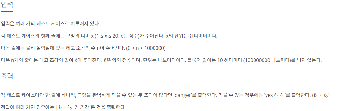문제를 요약하면 구멍의 너비가 주어지고 레고 블록의 길이가 주어질 때 레고 블록 2개를 활용하여 정확히 구멍의 너비와 일치하는 것 중 차이가 가장 많이 나는 블록 2개를 고르는 것이다.