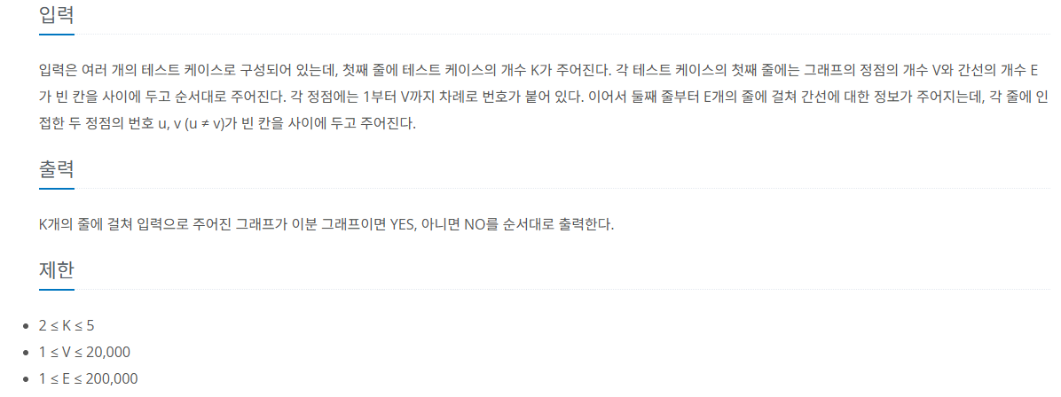 그래프가 입력으로 주어졌을 때, 이 그래프가 이분 그래프인지 아닌지 판별하는 프로그램을 작성하시오.