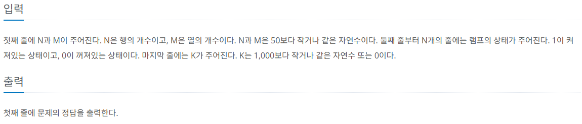 문제를 요약하면 램프의 초기 상태가 주어지면 K번 스위치를 조작하여 모든 램프가 켜진 행의 개수를 최대로 만들어야 한다.