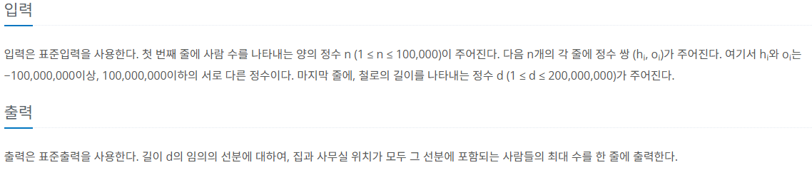 문제를 요약하면 사람들의 집과 사무실의 위치가 일직선에 위치하며 철로의 길이 D가 주어졌을 때 철로 안에 집과 사무실이 모두 위치한 사람이 최대가 되게끔 철로를 놓았을 때 포함시키는 수를 구하면 된다.