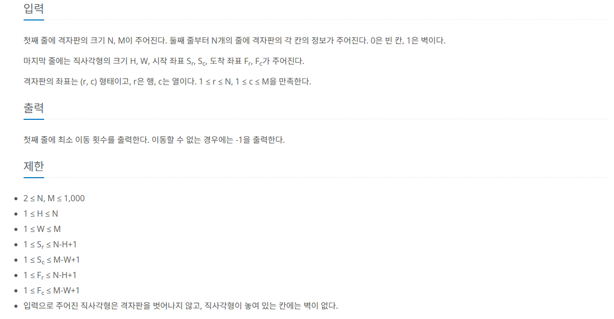 문제를 요약하면 왼쪽 위가 (Sr, Sc)에 위치하는 크기가 H x W인 직사각형의 왼쪽 위를 (Fr, Fc)까지 최단 길이로 이동시켜야 한다.