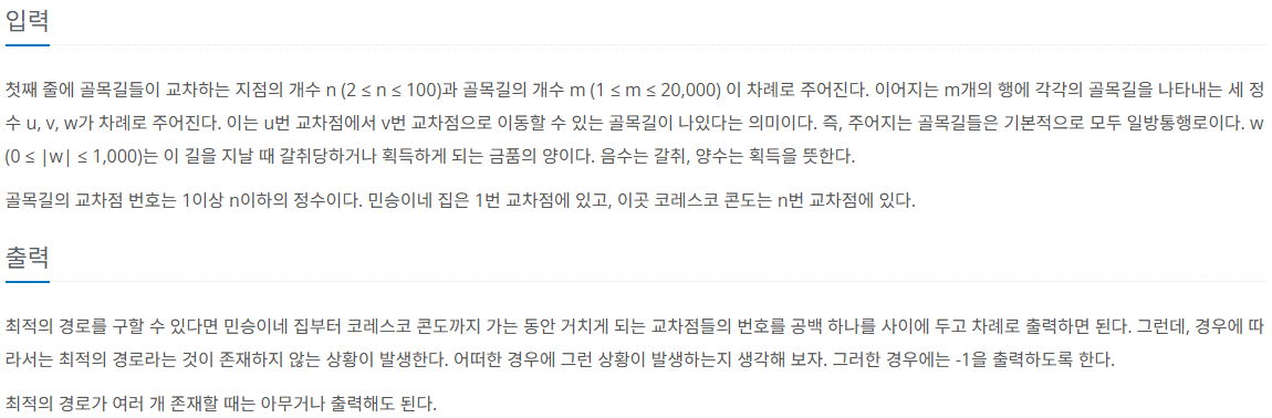 골목길의 연결 상태와, 각 골목길을 지날 때 갈취당하거나 획득하게 되는 금품의 양이 주어졌을 때, 민승이가 최대한 유리한 경로를 따라 집에서 코레스코 콘도까지 가기 위해서는 어떻게 해야 하는지 출력하는 프로그램을 작성하시오.